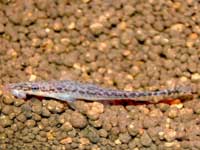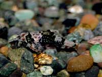 | メタリックグリーンに近いスポットが全身を覆っています。かなりきれい! | 落ち着くと体が溶岩石のような色になります。 | つぶらな瞳に頭でっかち。 | 写真で見るとどっちが頭でどっちが尾か分からなくなりそうです。 | ||||